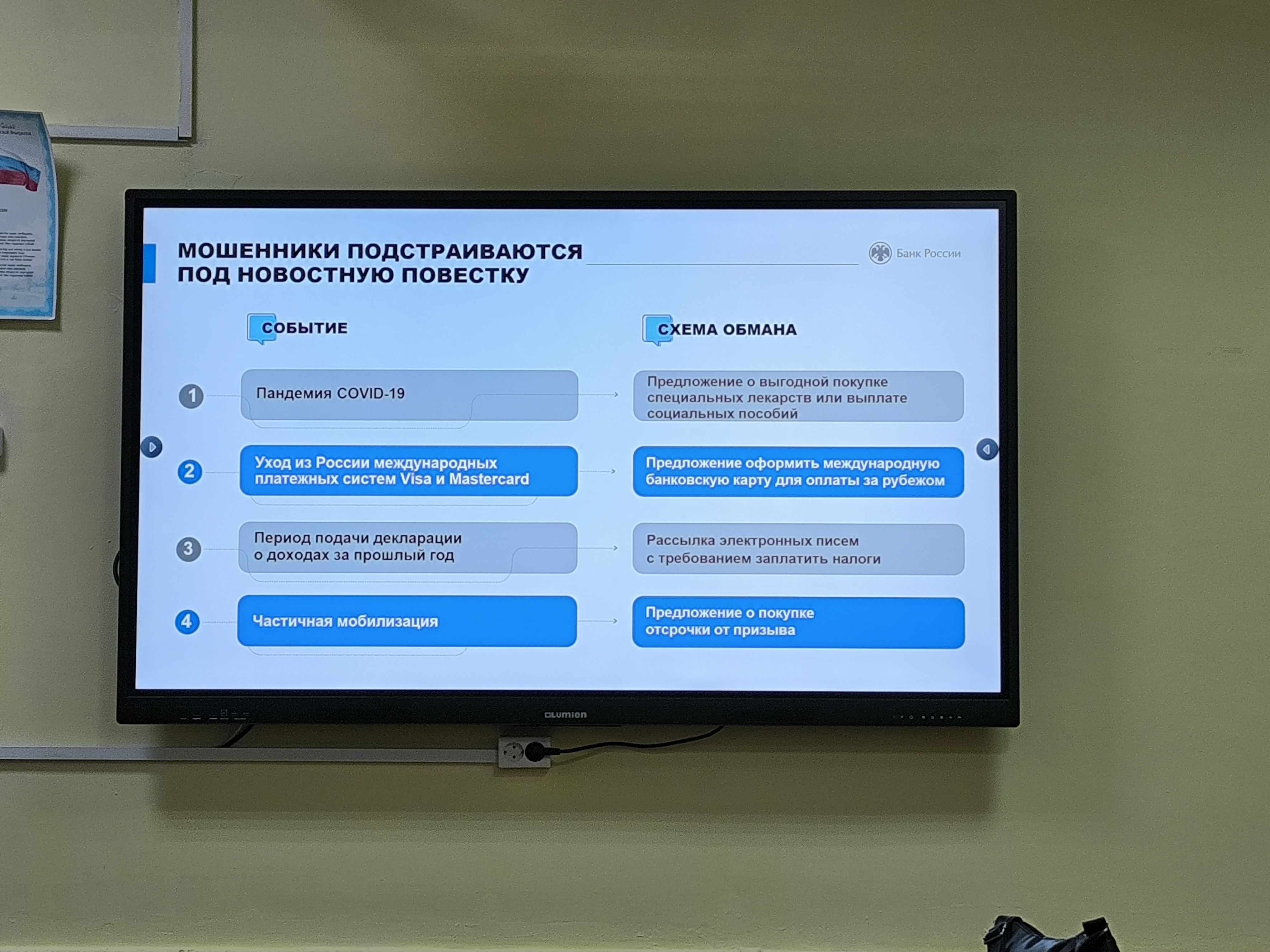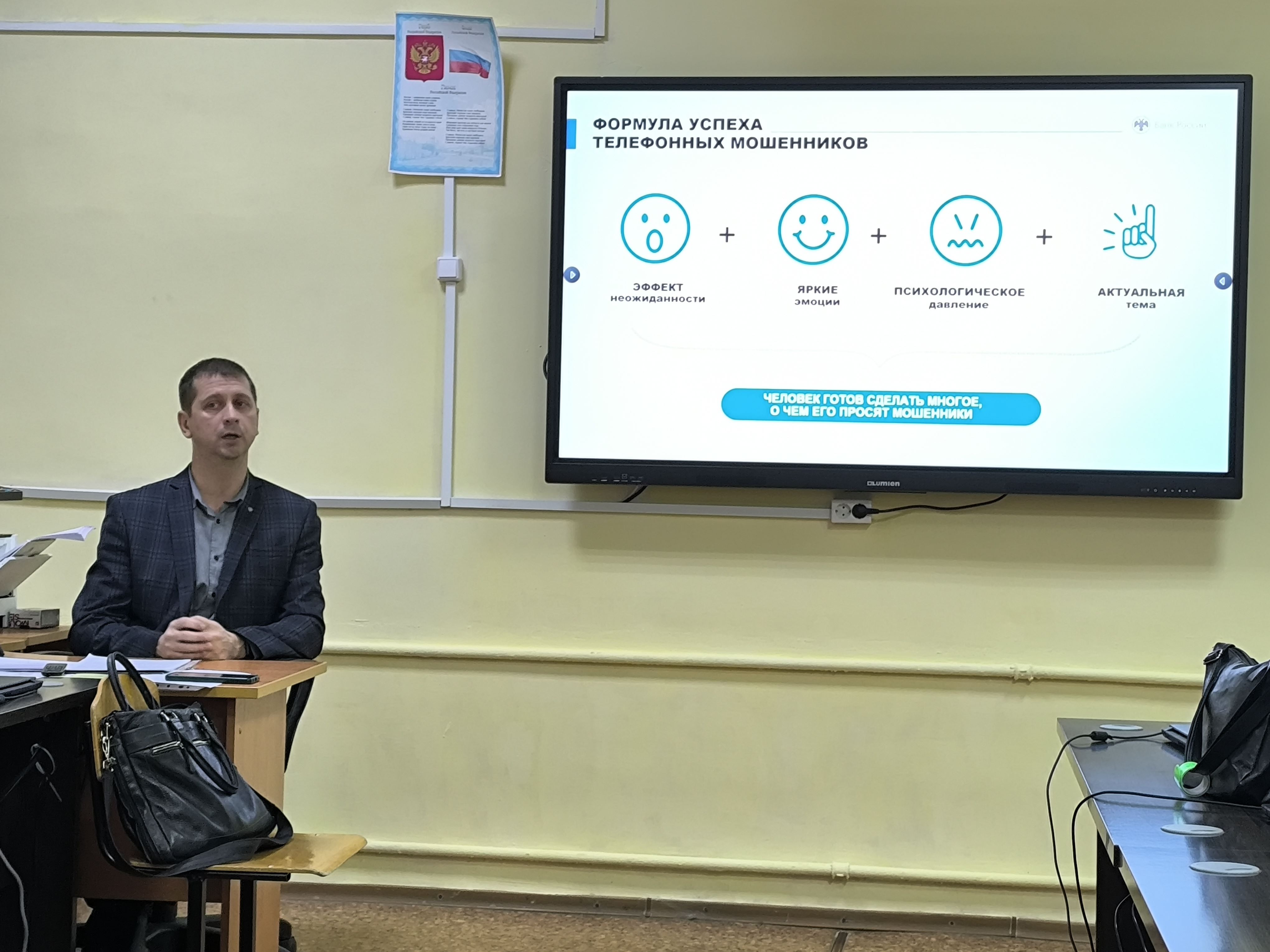 В ходе встречи собравшиеся узнали о фишинговых сайтах, популярных уловках в Интернете, о блокировке банковских карт. Кроме этого, Илья Евгеньевич представил формулу, по которой работают телефонные мошенники, пояснил кто такие "дропперы" и чем они занимаются, поделился информацией о новых распространенных мошеннических схемах и рассказал о мерах, предпринимаемых Банком России по противодействию кибермошенничеству.